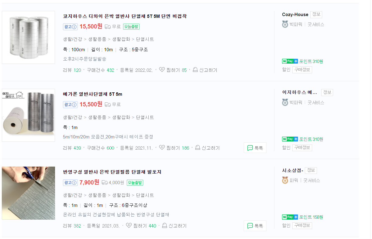 단열재는 은박 단열재 혹은 단열 매트로 검색하시면 롤의 형태로 판매하는 것을 사시면 됩니다.