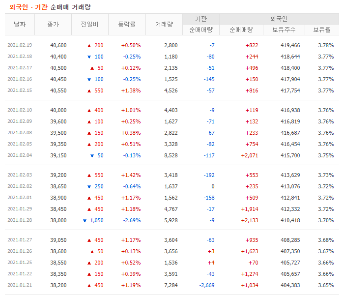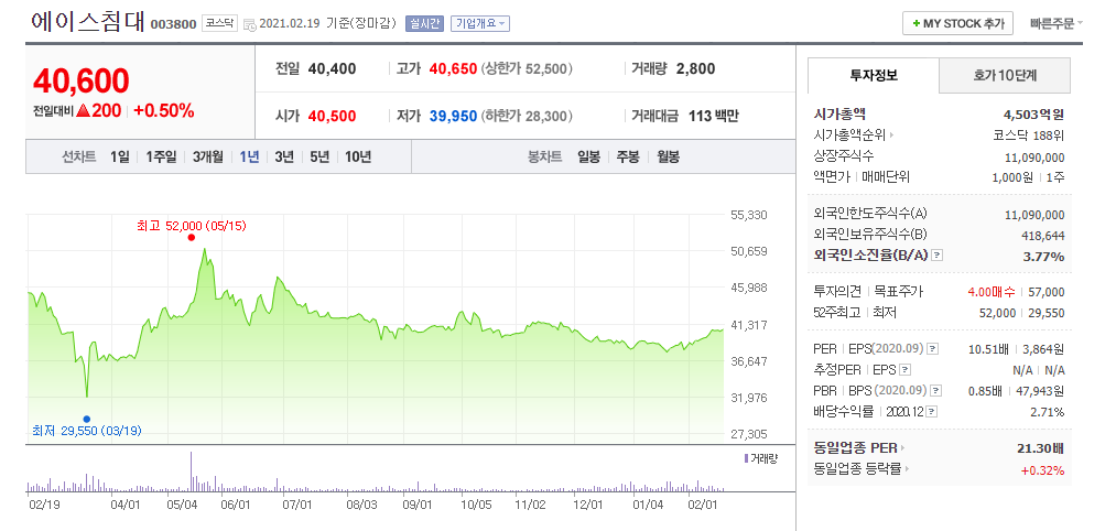 외국인 보유량은 상당히 적은수준으로 3.77% 보유 중이며, PER은 10.51로 약간의 저평가가 되어있는 상태입니다.
